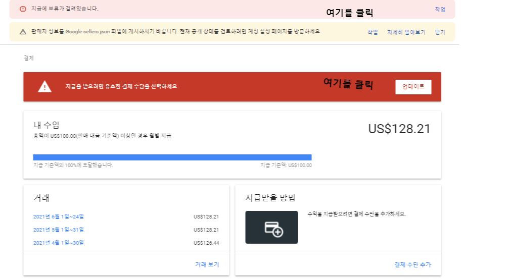 혹은 아래 경고 배너 <<지급을 받으려면 유효한 결제 수단을 선택하세요. 배너의 업데이트 클릭