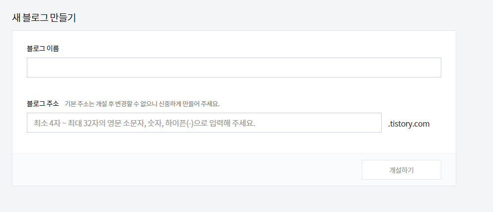 이제 내가 사용할 블로그의 이름과 블로그 주소를 입력한 후 개설하기 버튼을 클릭한다. 그럼 간단하게 티스토리 블로그를 추가 개설, 혹은 신규 개설 할 수 있다.