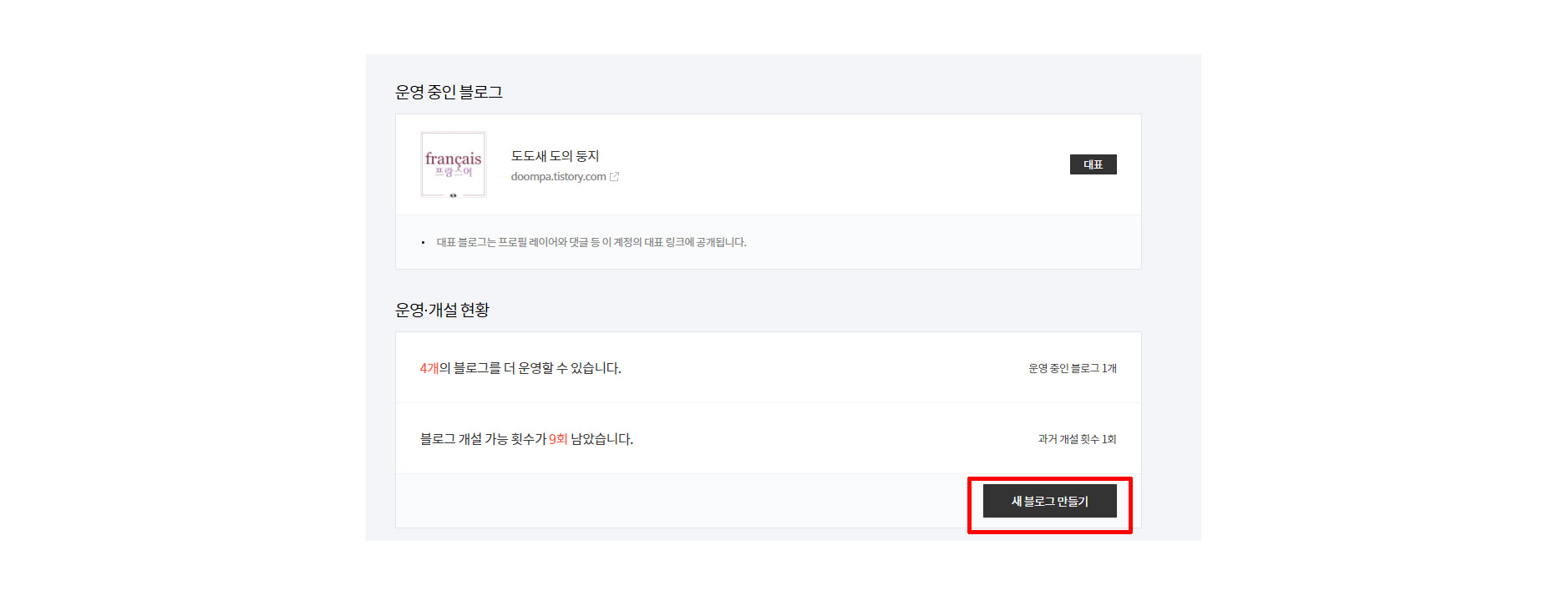 티스토리 블로그 우측 하단에 [새 블로그 만들기] 버튼을 클릭한다. 나의 경우 블로그 개설 가능 횟수가 9회 남았으며, 1개의 블로그를 운영 중이므로, 4개의 블로그를 추가 개설 할 수 있다는 설명이 있다.