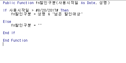 - 문자 식 결합시 & 사용(문자와 변수 결합 : 성명 & "님은 할인 대상")