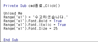가끔 폼 종료와 함께 엮여서 나오는 문제다. 폼 종료 버튼을 클릭시 셀이 글자가 나오게 하는 식을 작성해야하는데, 이는 unload me 식 아래에 쭉 기술하면 된다. 형식은 아래와 같다.