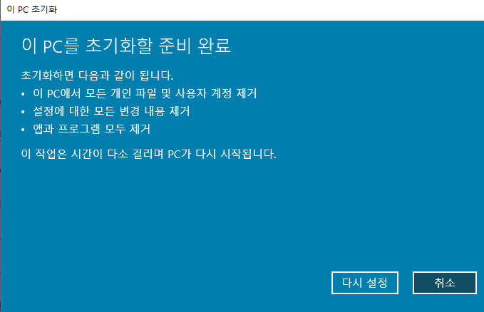 그럼 아래와 같은 화면이 뜬다. 이제 흐름에 맞게 버튼을 눌러주면 손쉽게 포맷이 끝나게 된다. 또한 윈도우 10은 이렇게 포맷을 지원하기 때문에, 포맷용 USB를 만들어서 포맷을 할 필요도 없다. 굉장히 손쉽게 포맷이 완료되었다.