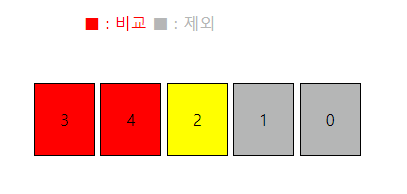 이렇게 하여 1회전이 끝나게 되었습다. 가장 작은 수인 0이 맨 뒤로 가게 된 것을 볼 수 있습니다. 이제 맨 뒤의 요소를 정렬 대상에서 제외하고 다시 처음부터 시작하게 됩니다.
