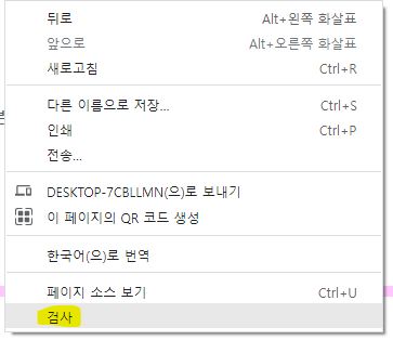 우선 마우스 오른쪽을 클릭하고, 검사를 클릭합니다.
