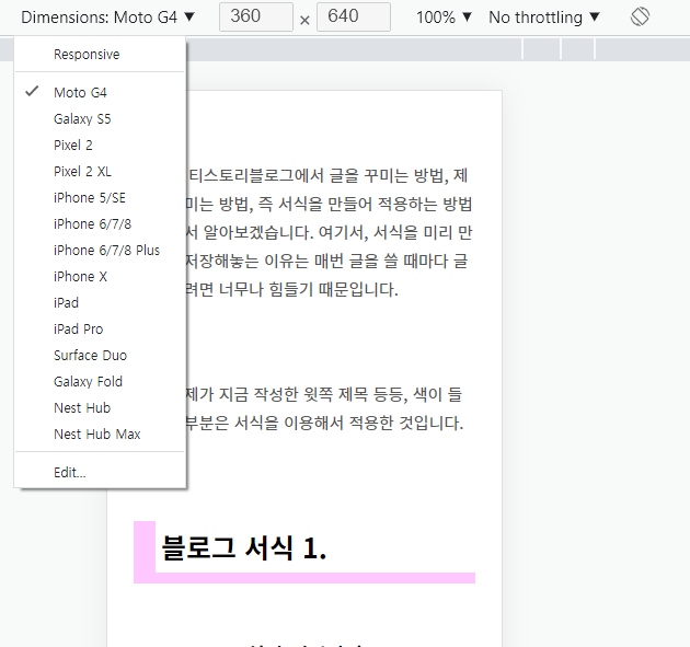 여기서 한 가지 팁이 더 있습니다. 스마트폰은 기종마다 화면 크기가 다르지요? 모든 기종이 가능하진 않지만 몇몇 기종은 해당 디바이스에서 내 포스팅이 어떻게 보이는지 판단이 가능합니다.