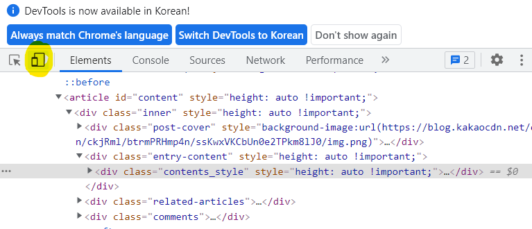 그럼 막 복잡한 화면이 뜰 것입니다. 해당 웹 페이지의 엘리먼트 등을 보여주는 페이지인데 신경 쓸 필요 없습니다. 오른쪽 위의 이 휴대폰 모양 버튼을 눌러줍니다.