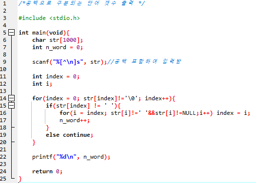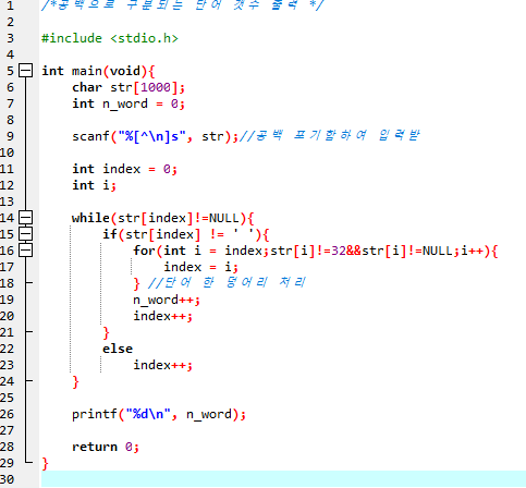 단어의 시작 값(현재 인덱스 배열값)에서 공백을 만날 때까지 진행하여, index값을 검사하기 시작한 단어의 마지막 값의 인덱스로 지정하고, 단어 개수를 의미하는 n_word를 1늘립니다.