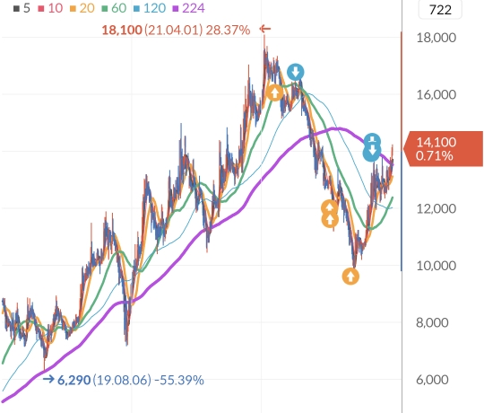 이 주식 역시 여전히 흘러내리고 있다. 다만 첫 매수 때 +15% 정도의 수익을 보고 나올 여지가 존재했다.