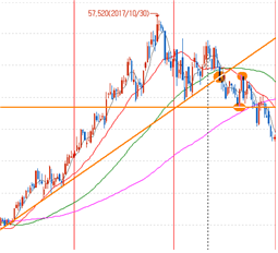 ■ 주가가 추세선을 이탈할 경우 전날의 종가를 확인 하여야한다. 상향 추세선의 경우 전날의 종가가 장중 고가 근처에 있다면 하향 이탈은 가짜일 가능성이 높다. 반대로 종가가 장중 저가 근처에 있다면 이탈은 진짜일 가능성이 높다.
