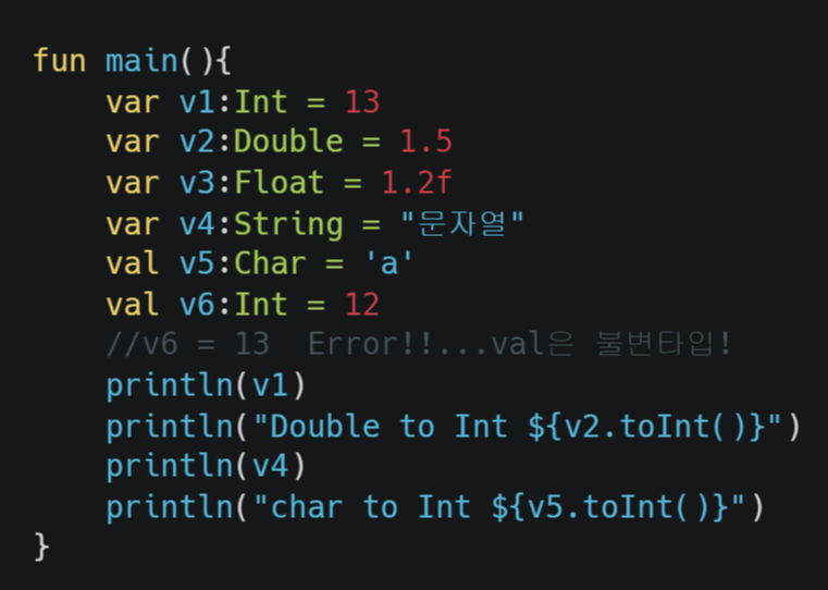 ■ val은 불변 타입 변수를 만듬, 즉 초기 값 만들면 나중에 다른 값 재할당 불가