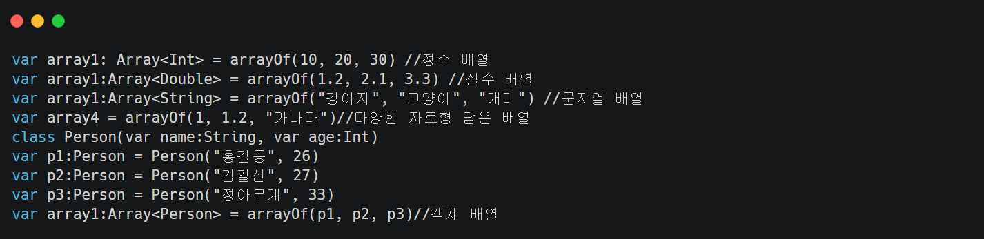 var 배열이름 : Array<배열에 담기는 타입> = arrayOf(값)