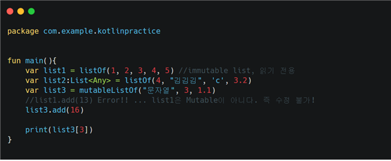 var 리스트이름 : Array<배열에 담기는 타입> = listOf(값) //읽기전용, immutable list