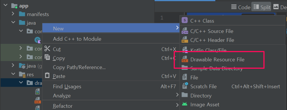 drawable 폴더 -> New -> Drawable Resource File을 클릭해 파일 하나를 생성한다.