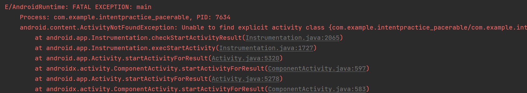 인텐트로 다른 액티비티로 넘어갈 때 발생한 에러이다.