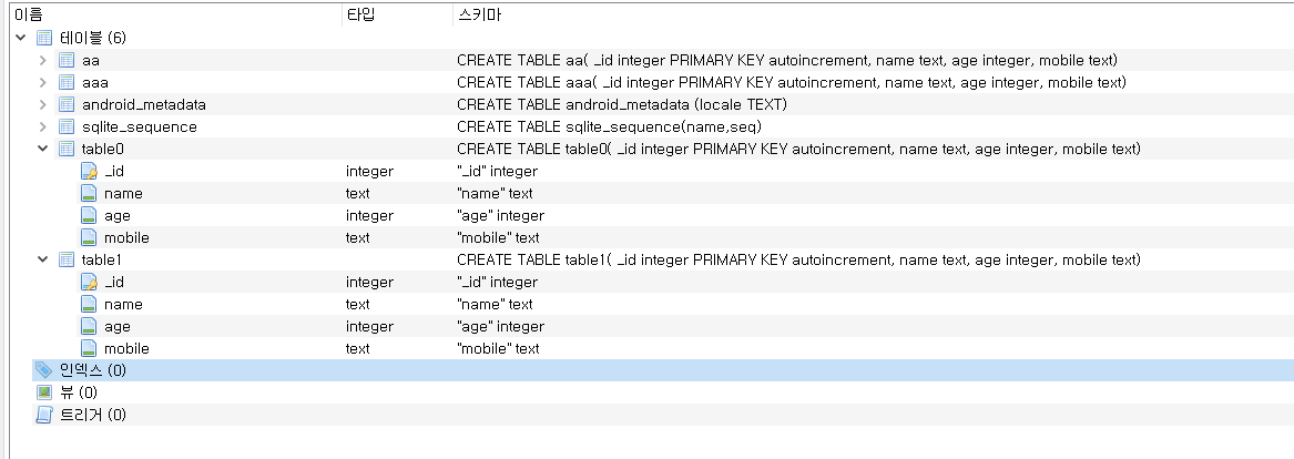 방금 만든 table0와 table1이라는 테이블이 보인다. (aa와 aaa는 사전에 본인이 만든 다른 테이블)