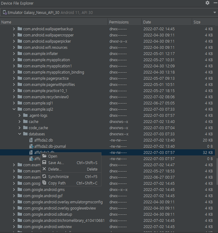 이후, 해당 클래스를 이용해 getWritableDatabase() 메서드를 호출하기만 하면 SQL파일이 만들어지게된다. 어떤 방식으로 데이터베이스를 만들던지 만들던지 SQL파일은 사용자의 내부 저장소에 비공개 폴더로 저장된다.