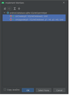 두 메서드를 모두 클릭한 후, OK버튼을 누르면 된다. 각각 데이터베이스가 만들어졌을 때, 그리고 열렸을 때 호출되는 메서드이다.