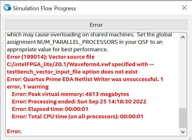 Quartus_FPGA/Waveform.vwf specified with –testbench_vector_input_file option does not exist