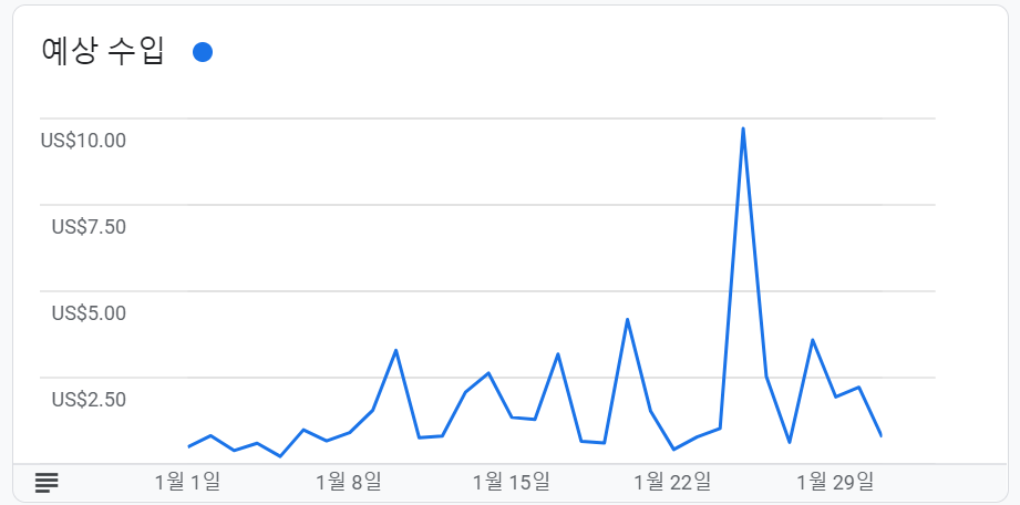 애드센스의 2023년 1월 1일부터 2023년 1월 31일까지의 예상수입은 약 52달러이다. 이를 한화로 치환하면 63,980원이라는 금액이 된다.