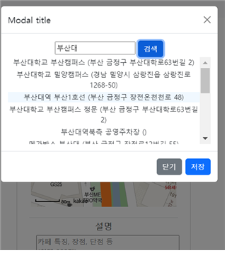 일단 버튼을 누르면 모달 팝업을 뛰우고 거기서 검색을 하면 검색 결과를 받아와서 배열로 보여주고, 해당 아이템 중 하나를 클릭하면 현재 input태그에 해당 값이 들어가도록 하면 되지 않을까? 내가 저장할 것은 위, 경도니까 invisible한 인풋 태그도 만들면 되겠다....