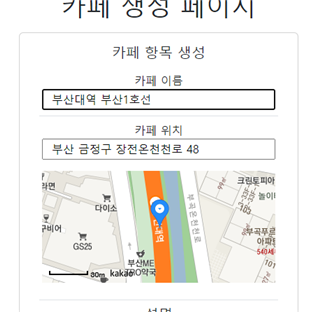그리고 뭐 마커 생성하고, 맵 이동하고 등등의 작업도 여기서 진행되었다. 어쩌다 보니 맵과 관련된 js코드만 100줄이 되어서 살짝 심란하지만, 어쩃든 맵과 관련된 작업을 일부 완성했다. 사실 카페를 생성하는 사람에게 맵을 보여주는 건 선택사항이었지만, 내가 딱 주소를 보고 위치 가늠이 한 번에 안 되길래 넣었다. 사용자 경험이 중요하다고 하니까.
