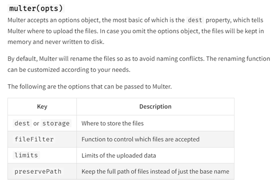 multer문서를 보면 dest가 아니라 storage를 사용하여도 저장할 장소를 나타낸다는 것을 말해준다.