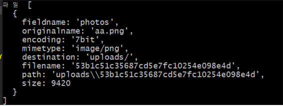 앞서 파일은 req.files에 저장된다고 했다. 콘솔에 찍어보면 아래와 같은 형태를 가진다.