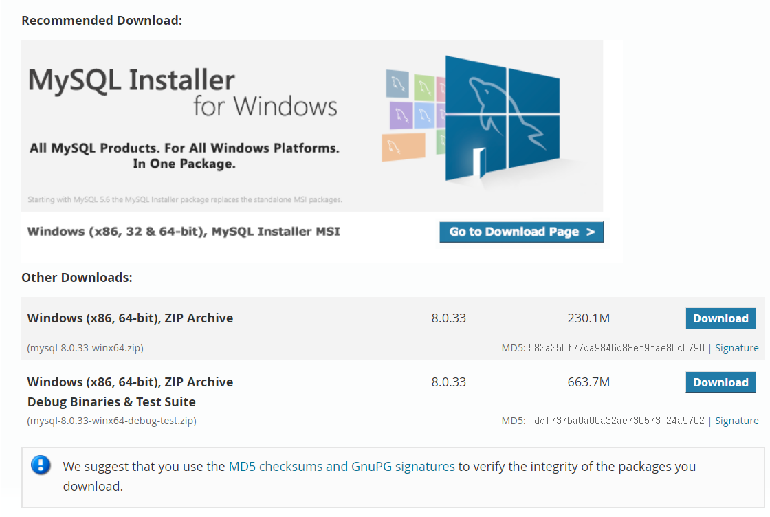 위의 링크에 접속에 자신의 운영체제에 맞는 mySQL을 다운로드한다.