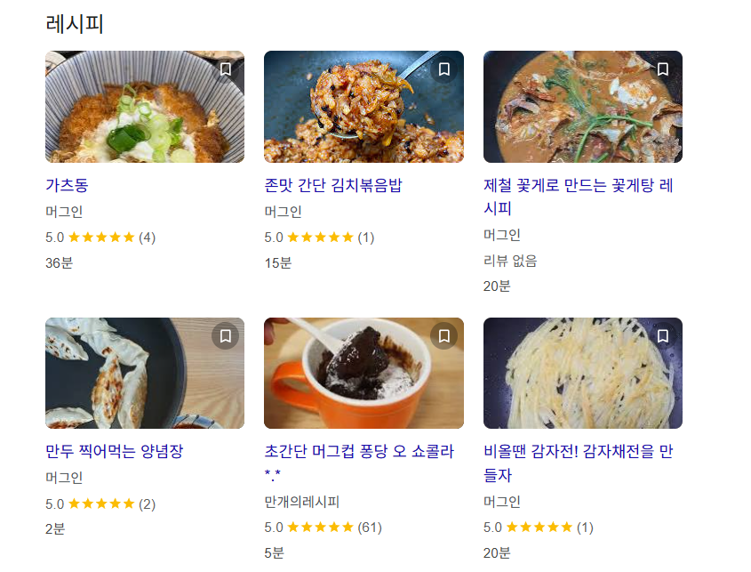 - 즉, 현재 구글에 머그인 레시피, 라고 검색하면 레시피 항목에 아래와 같은 항목들이 나열된다.