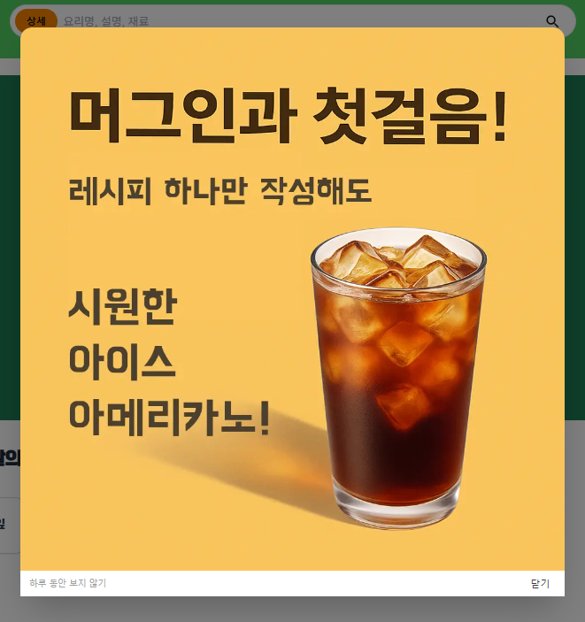 레시피 하나를 작성하면 아메리카노를 주는 이벤트. 하지만 요새 기업이 하는 이벤트에 비하면 너무 조촐해 큰 메리트가 없는 이벤트라는 것을 나는 안다. 그러나 이보다 더 큰 이벤트를 내가 할 수 없다는 것도 안다.