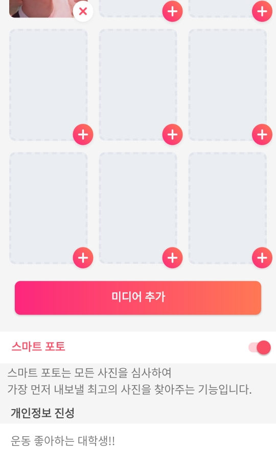 틴더를 쓸 때 우선 해야할 것이 프로필을 작성하는 것입니다. 앞서 말했듯 상대방에게 좋아요를 받아야 하는 시스템인지라, 자기가 가진 사진 중 최고의 사진을 올려놓으세요. 선택을 받을 수 있게.