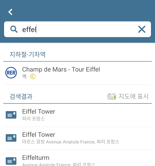 우선적으로 RER에 Tour Eiffel(에펠탑)이라는 역이 있다고 뜬다. 경로를 확인하자.