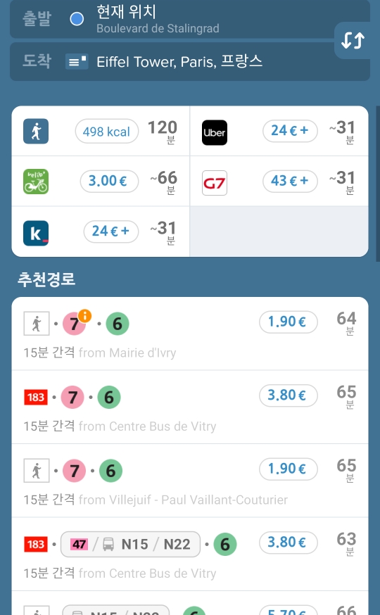 짠. 놀랍지 않은가. 다양한 교통 수단을 소개해주며, 이동 시간 및 가격까지 보여준다. 나는 첫번째 항목 파리 지하철 7호선-6호선 환승을 살펴보겠다.